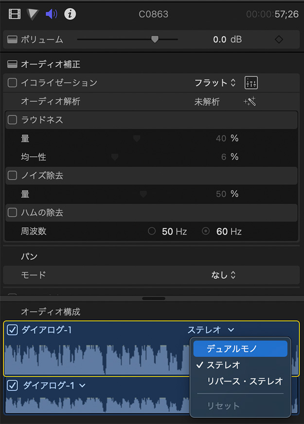 内蔵マイクの多くがステレオだ。しかも、臨場感を出すために周囲全部の音を極端にわかりやすいステレオ感のある味付けをしているものもある。周囲の音を満遍なく録音する設定だと、周囲の音が大きくなり、人の声がぼやける。これを回避するためには、カメラ内にステレオ感の調整ができるものであればスピーチモードなどに変更する(キヤノンのXAシリーズなど)。そうでない普通のカメラの場合には、編集時にステレオの左右、歩どちらか一方の音だけを使うようにする。たったこれだけで見違えるように聴きやすい声に変わるはずだ。ポイントは、編集アプリのデュアルモノラルという設定だ。