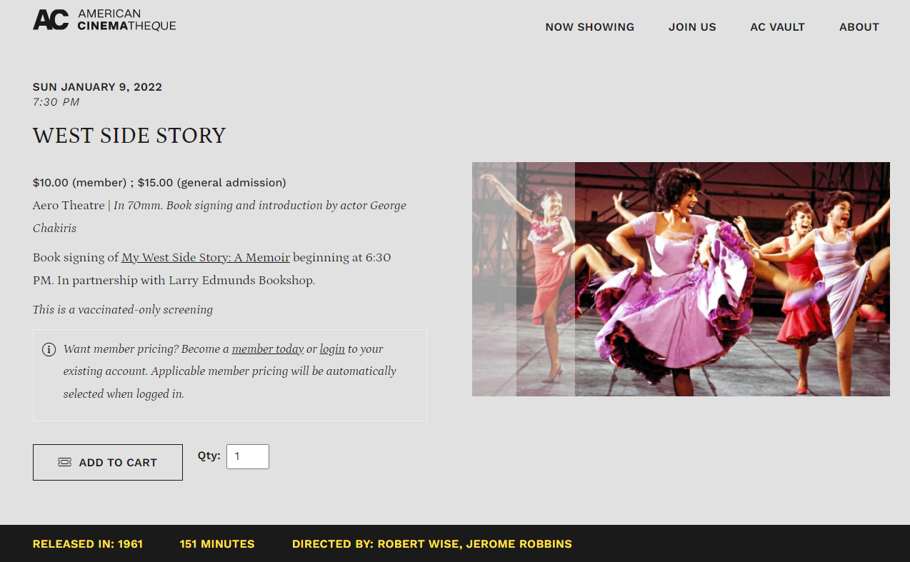 前述のとおり、「スピルバーグ版」が12月末から全米の映画館で公開中。このタイミングに併せて、「オリジナル版」のリバイバル上映が開催されるという情報が飛び込んで来た。 これは、もう行ってみるしかないだろう。また、「オリジナル版」(1961) と「スピルバーグ版」(2021)の比較も、体感してみたかった。そんな訳で、筆者はサンタモニカにあるAero Theatreまで、足を運んでみる事にした。