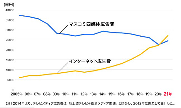地上波テレビ広告費は前年比で11.7%増と大幅に回復した。一方インターネット広告は22.8%をテレビの2倍の増加である。これはよく見かけるこの推移のグラフで分かる通り、ネット広告の著しい伸びがコロナによってさらに加速したということだ。