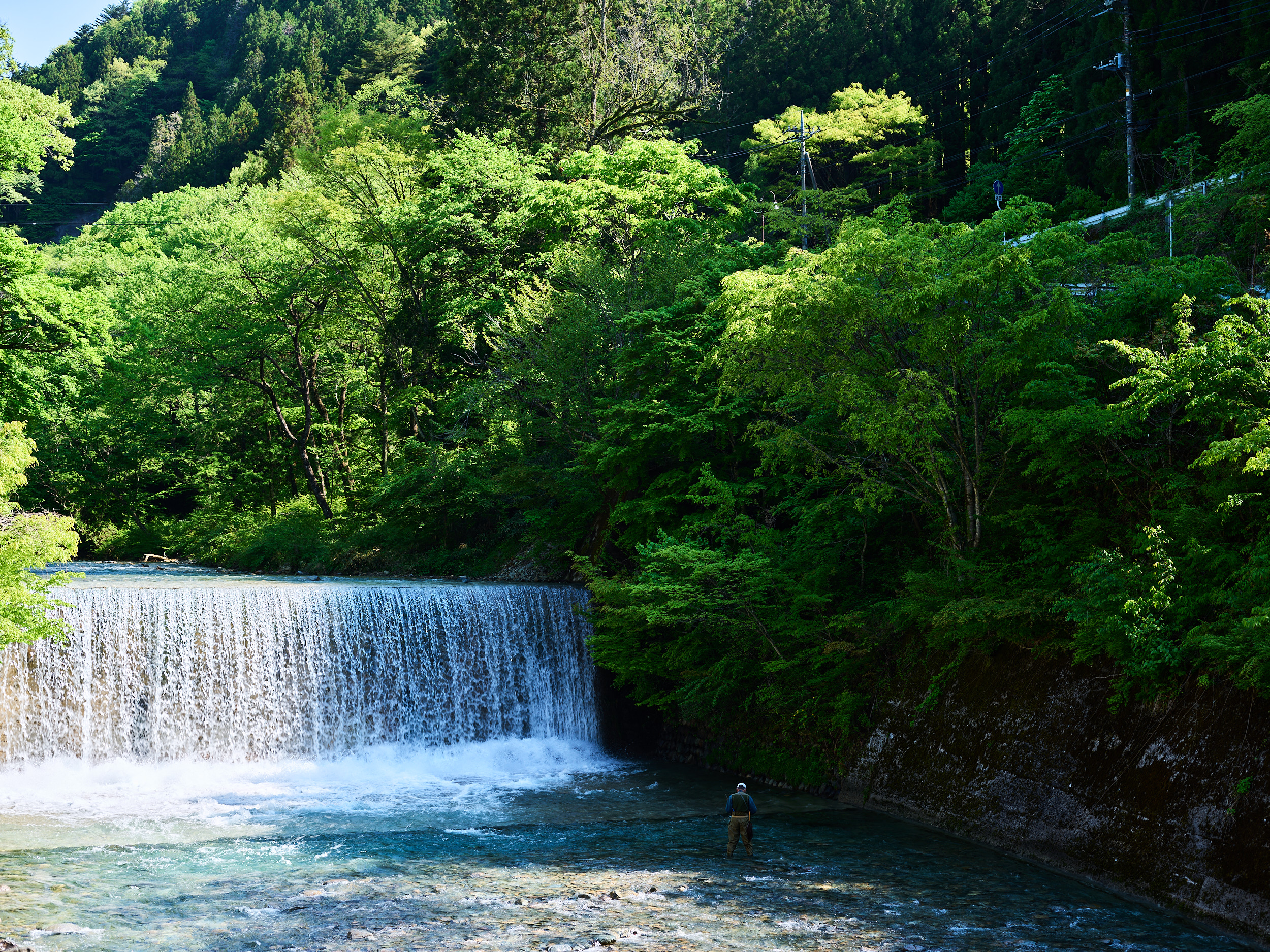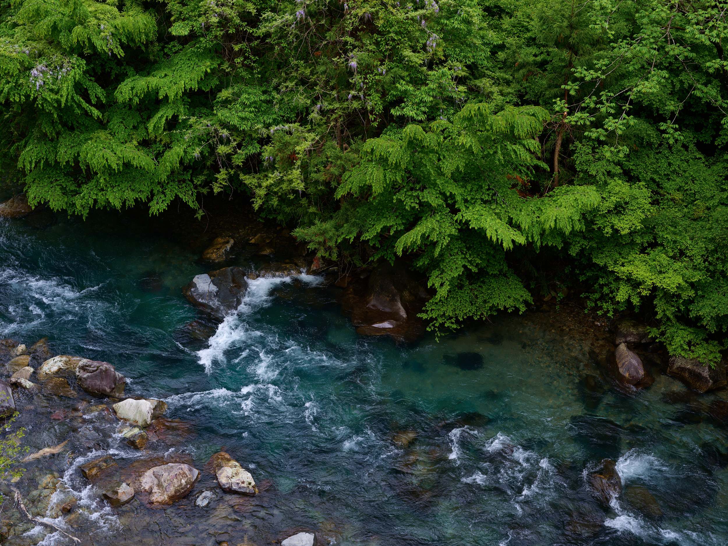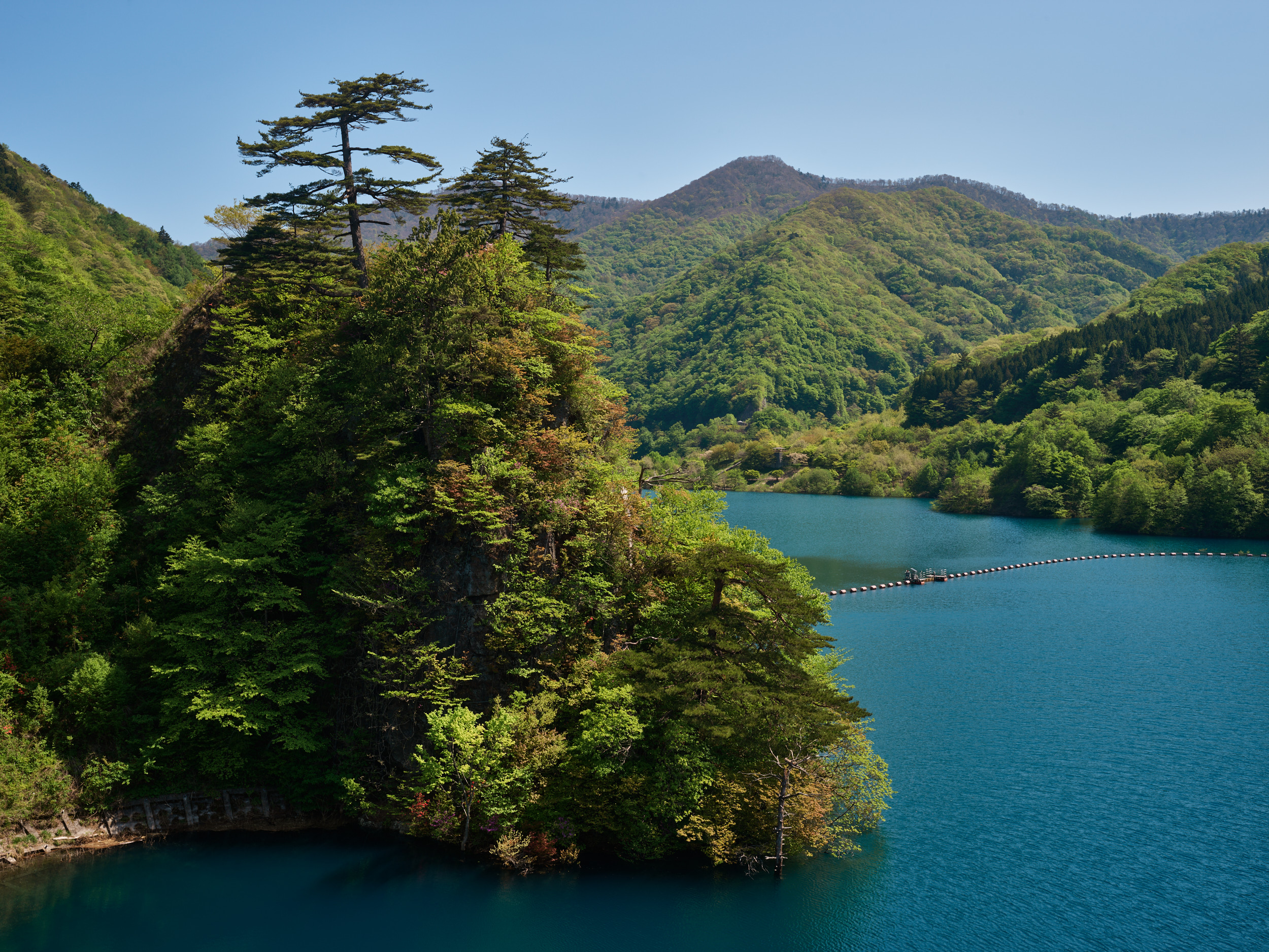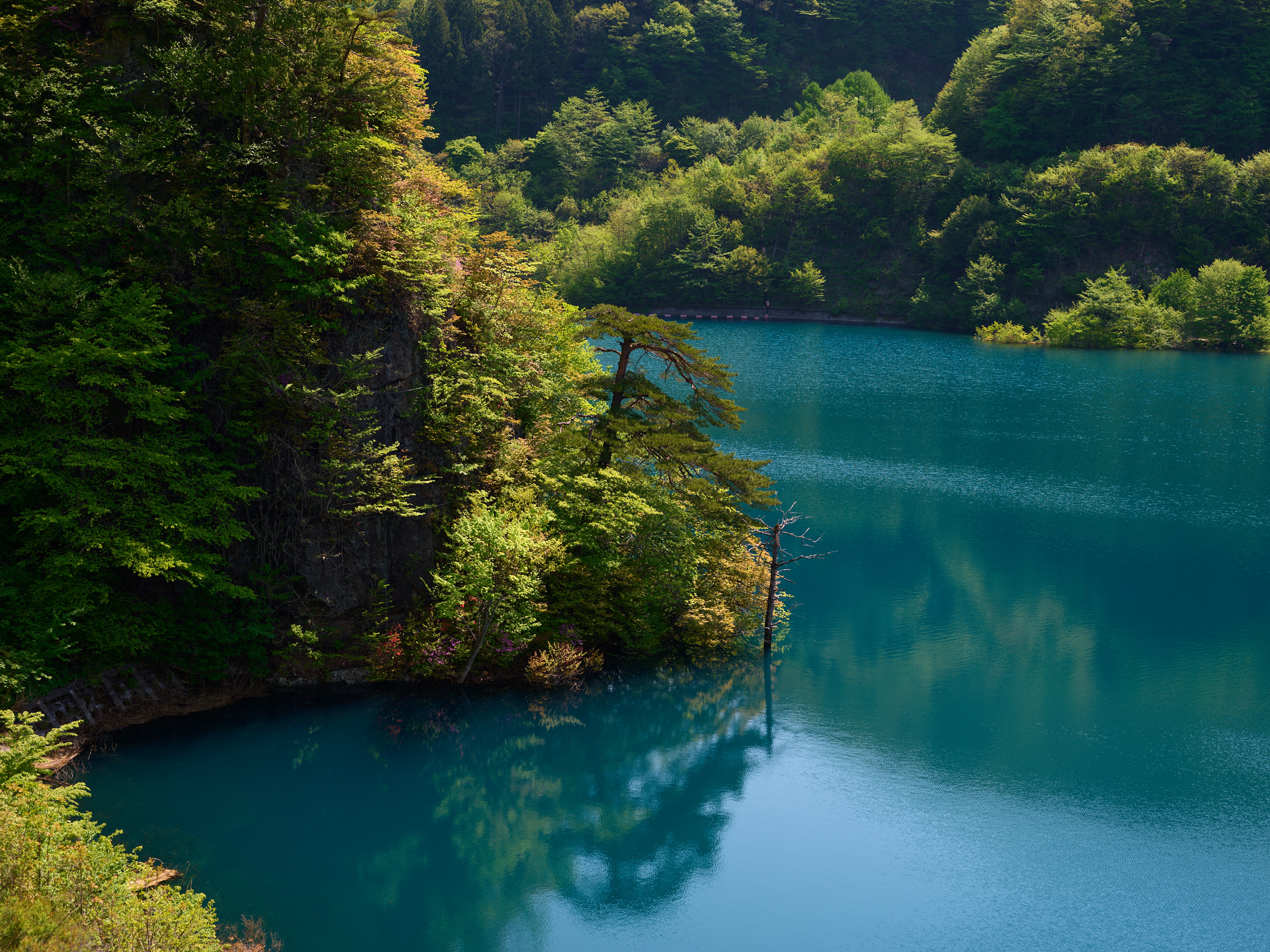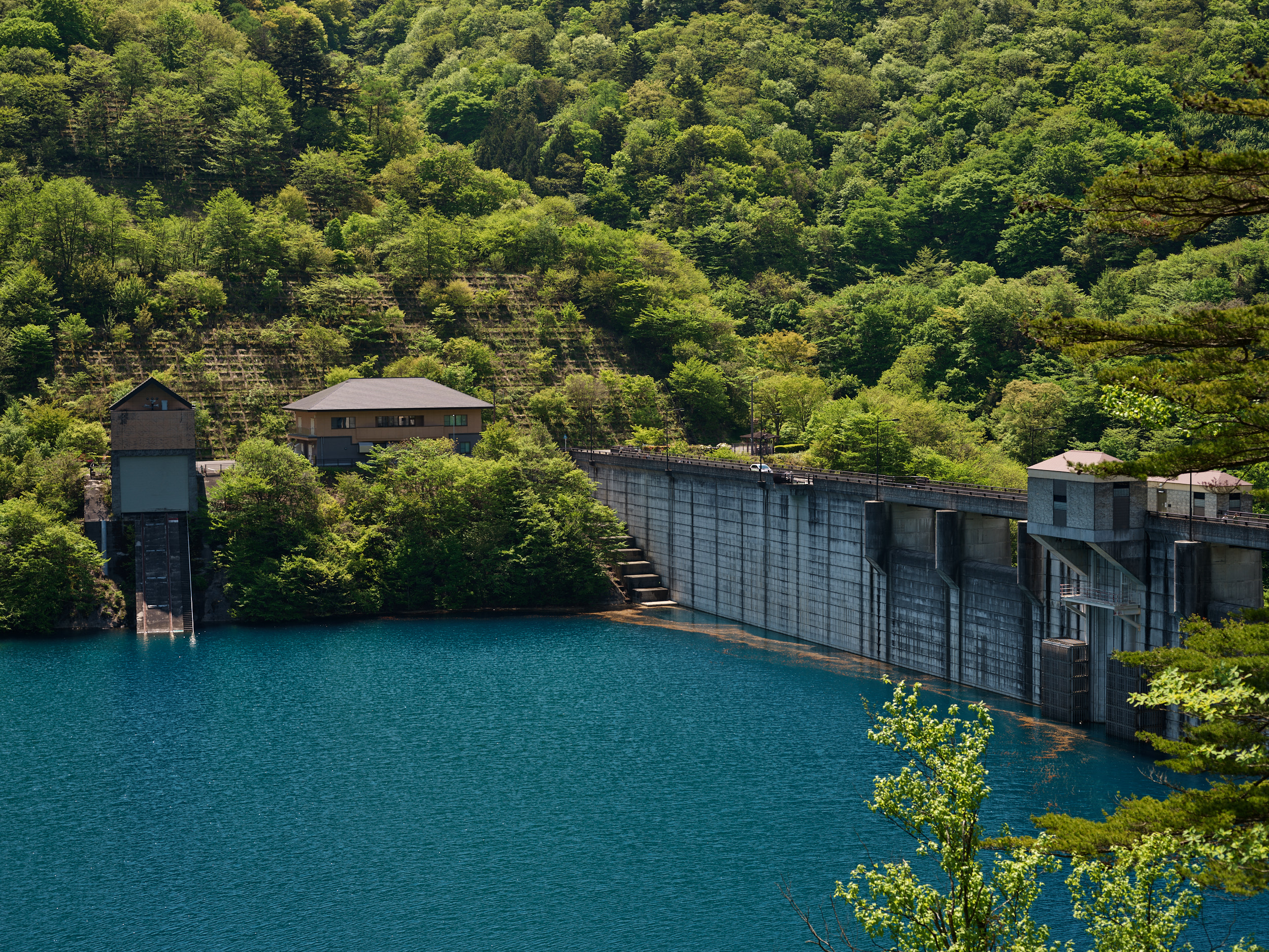 群馬在住のカメラマンさん(IQ4 100MP Trichromatic ユーザー)に案内していただき、四万温泉の一番奥に位置する奥四万湖(おくしまこ)へ。四万川をせき止めたダム湖で、その水の青さで有名なスポットだ。青く染まる理由は諸説あるようだが、この絶妙な青色は「四万ブルー」と呼ばれているらしい。