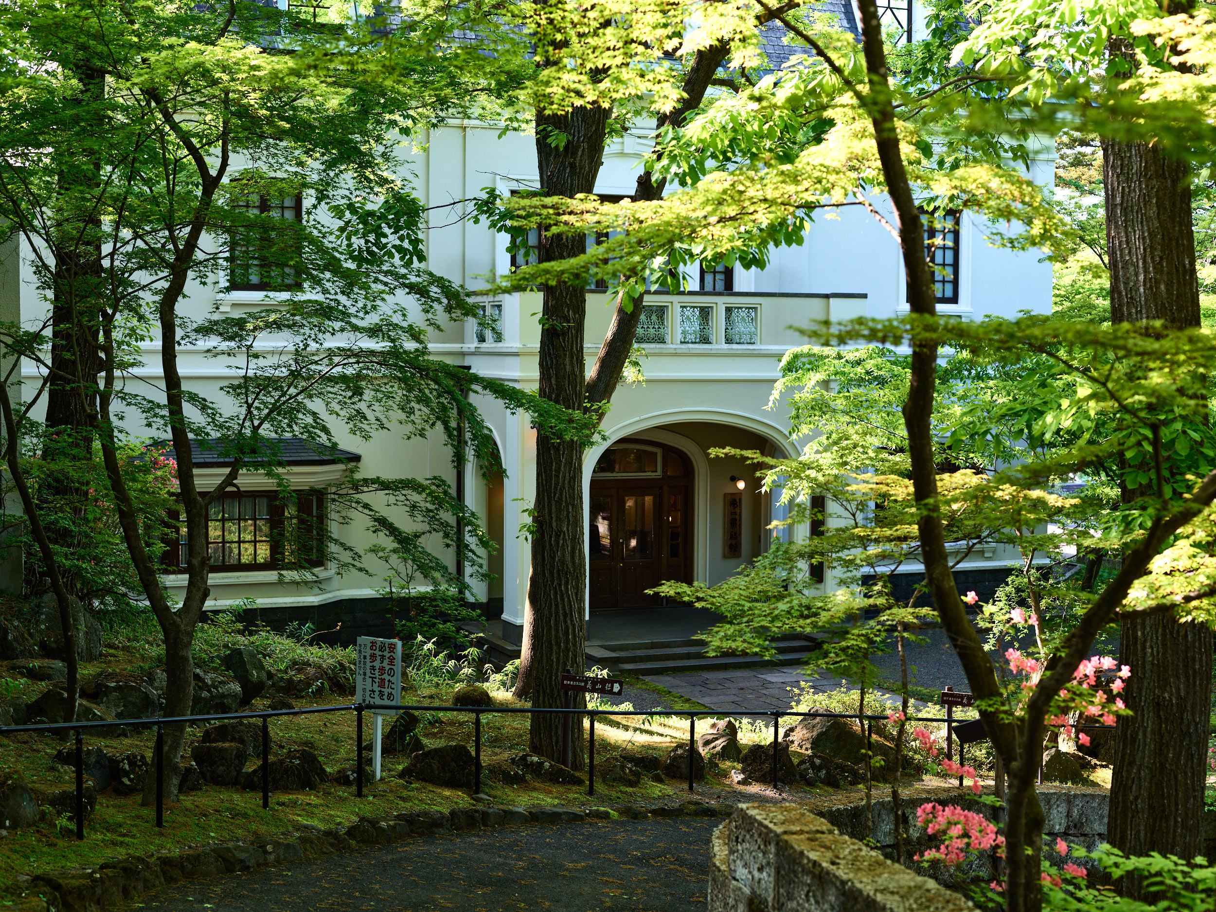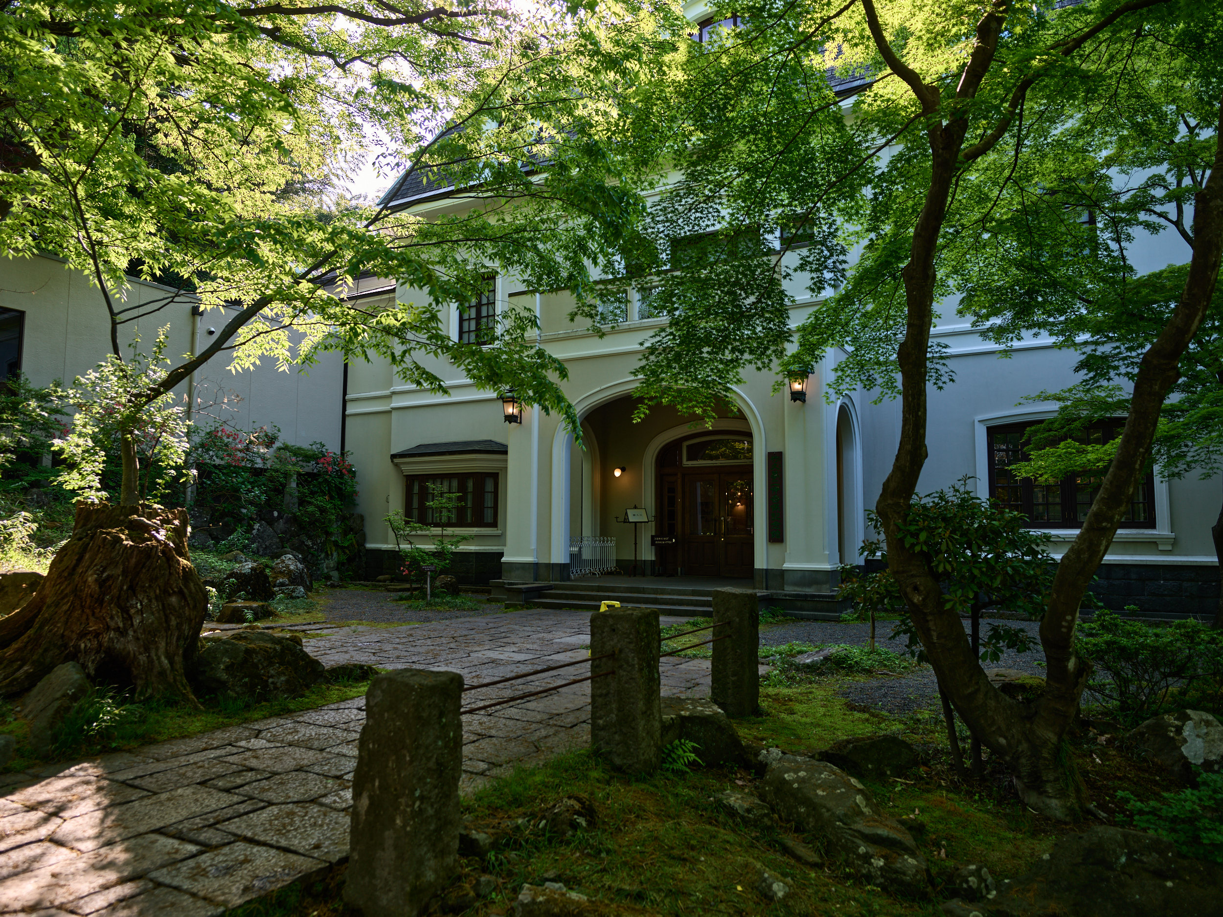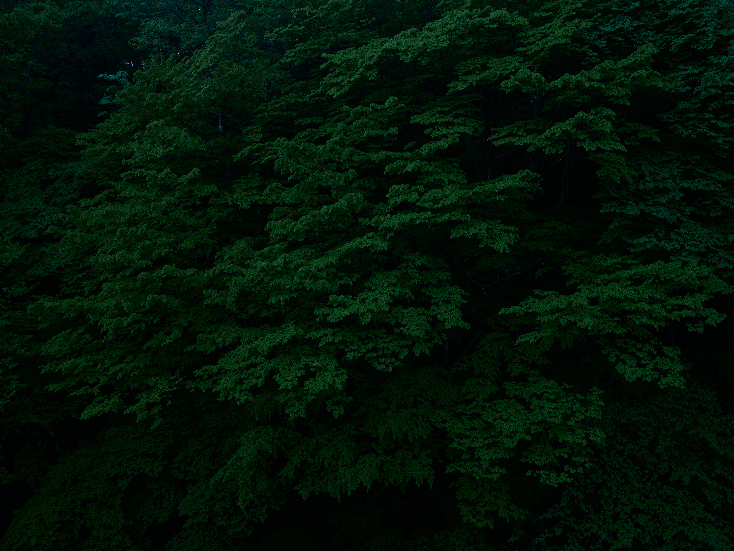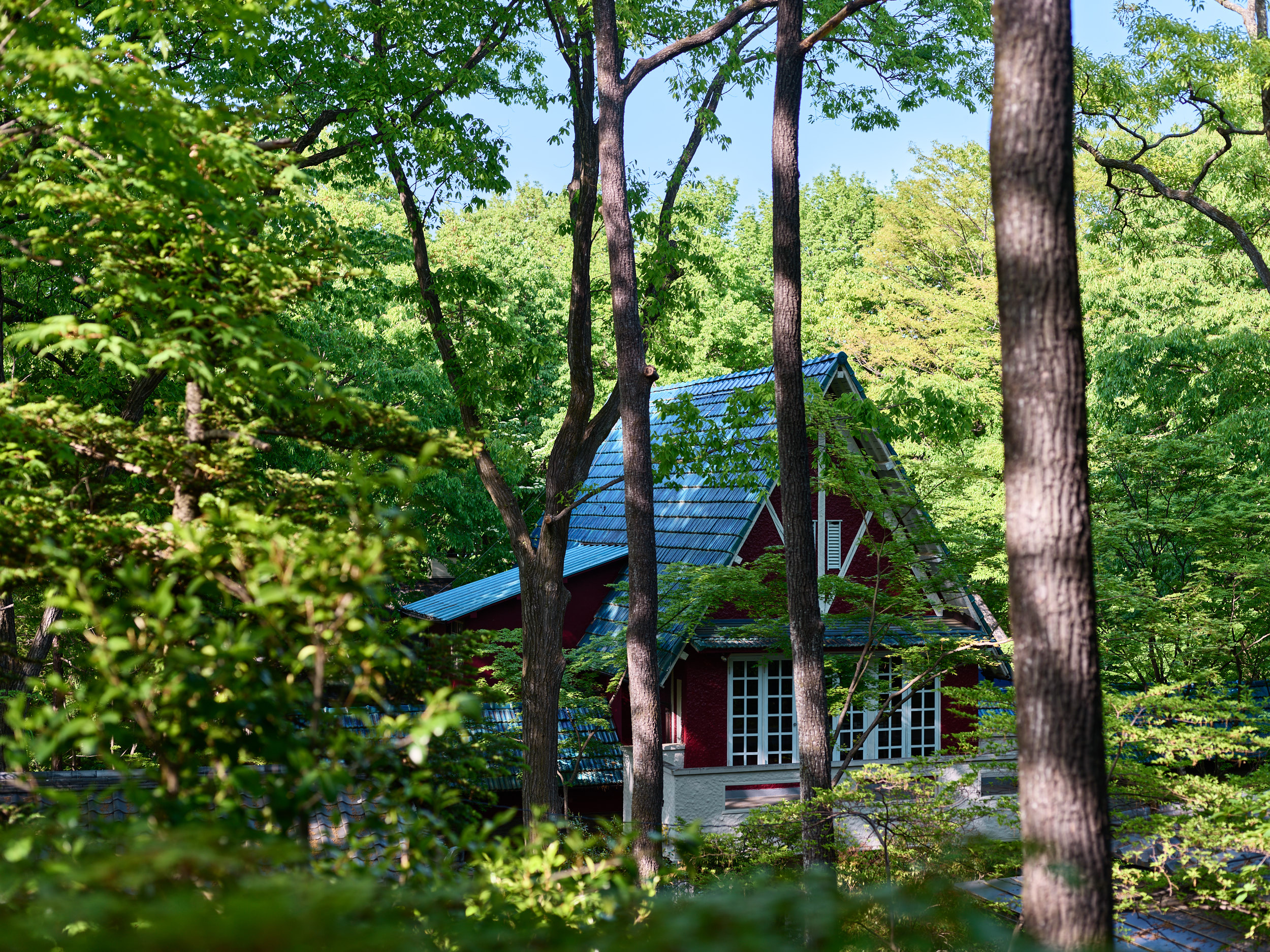 渓谷側の部屋を予約し、朝霧に浮かぶ渓谷を期待して早起きするも見事な晴れ。ベランダにも出られないようになっていたので、早朝からただ目の前を覆う木々を撮る。