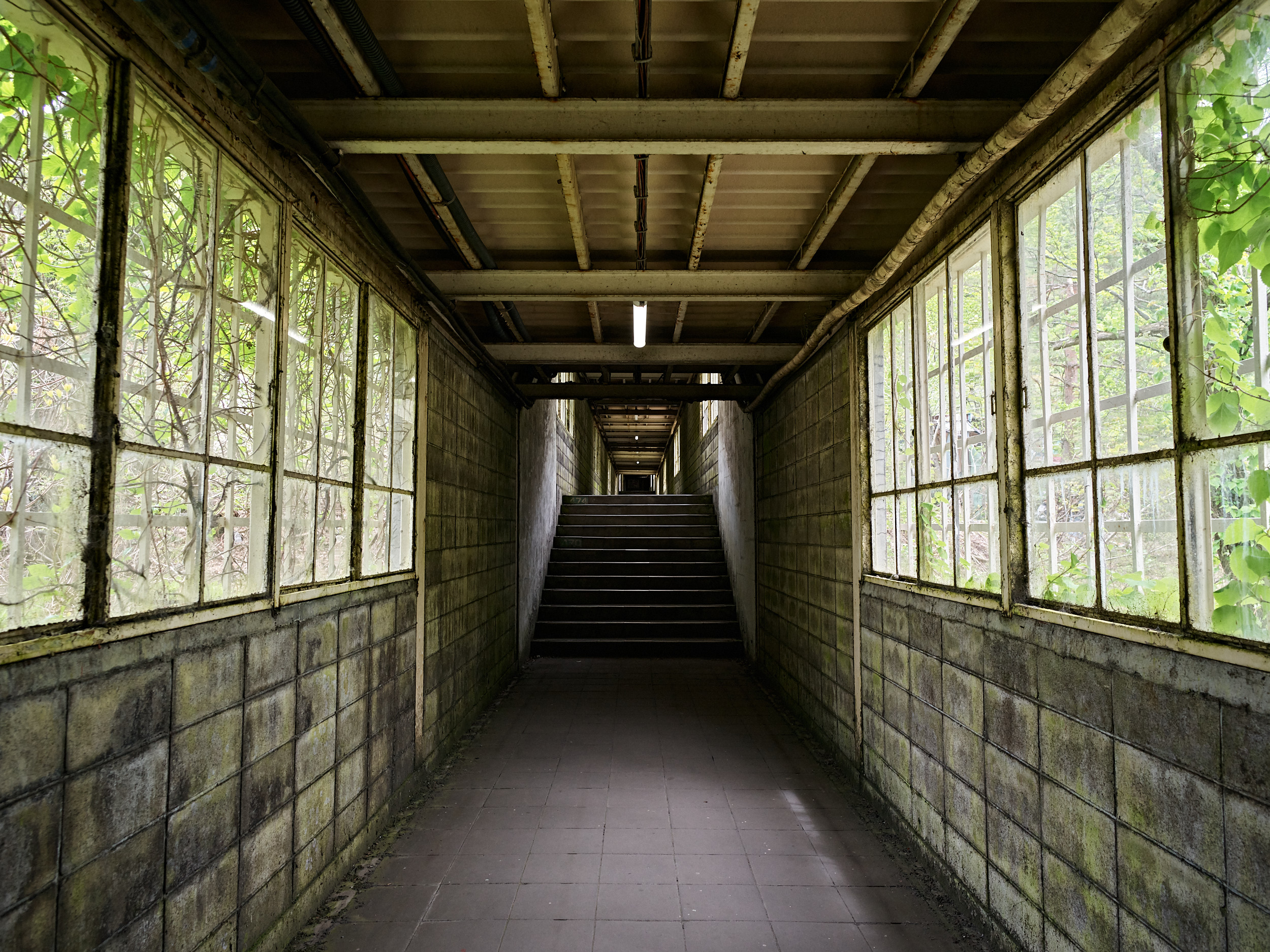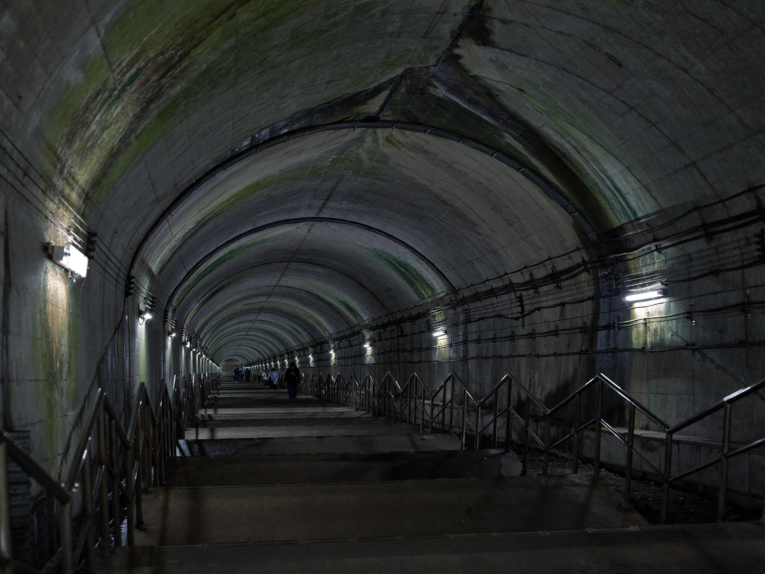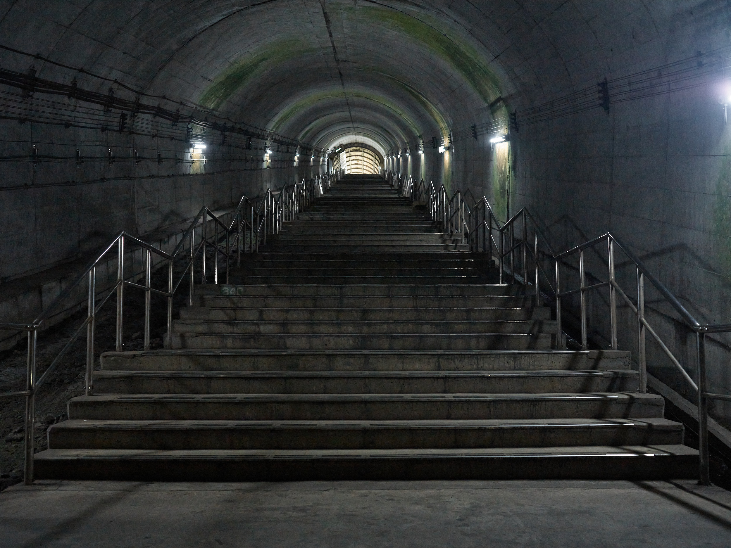 事前に情報を知った上で訪れたのだが、この階段は想像をはるかに超えていた。少し降りたところで写真を撮る。長い長い階段を登ってくる人が見える(拡大すると10人ほど確認できた)。途中には休憩用ベンチが数カ所設けられているが、諦めて引き返す人も少なくない(次の駅で引き返せば地上ホームに着く)。