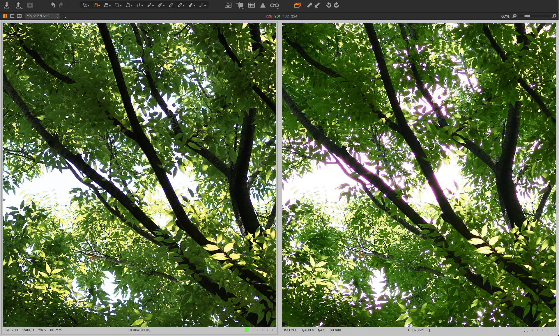 Capture Oneで表示・編集する際には、純正ソフトということもあってか、さほどデータの重さを感じることなく、FireWire用に残している2012年式のMacBookPro(SSD置換、16GB RAM)でもそれほどのストレスなく実用できた。