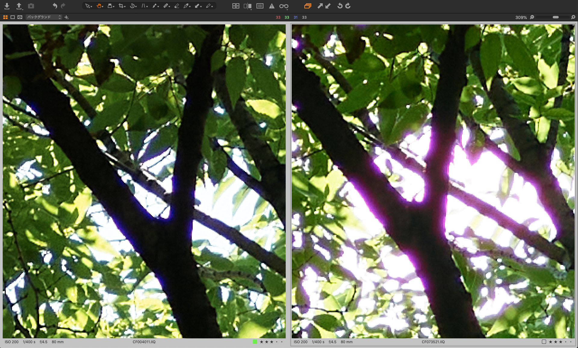 ただひとつ、明確な違いもあった。輝度差が大きいシーンでF4.5と絞りを開けた状態(=パープルフリンジが出やすい条件)でのテストだが、通常モデルでは強力なフリンジが発生し、Capture Oneのパープルフリンジ軽減を使用しても「焼け石に水」状態なのに対し、トリクロマティックではほとんど発生せず。