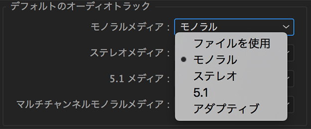 Premiere Proはオーディオを読み込む際に「ファイルを使用」「モノラル」「ステレオ」「5.1」「アダプティブ」のどれかに合わせてオーディオの形式を設定できます。