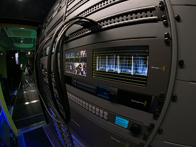 車内の信号ルーティングは、Blackmagic DesignのSmart Videohub 40×40で管理される。Smart Videohubはテクニカルコントロールルーム内に設置されており、隣には収録・バックアップに使用するHyperDeck Studio Pro放送用デッキがラックに複数搭載されている。他にもTeranex Expressスタンダードコンバーターが複数台設置されており、GH Oneの制作チームは外部から受信するあらゆるビデオソースを標準化できる。