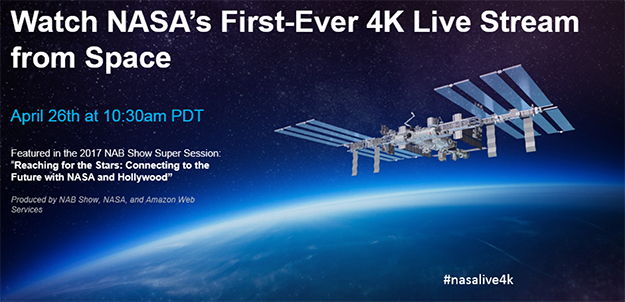 NABのスーパーセッションにて、宇宙からの4K映像をライブビューイングするイベントが実施される。NASAとAmazon Web Services(AWS)、そしてAWS傘下のElemental Technologies(エレメンタル)が、宇宙から会場までの映像配信で技術協力する。ラスベガスコンベンションセンター(LVCC)内での4K映像ライブビューイングに併せ、マルチスクリーンに4K/HD両方でストリーミング配信する。