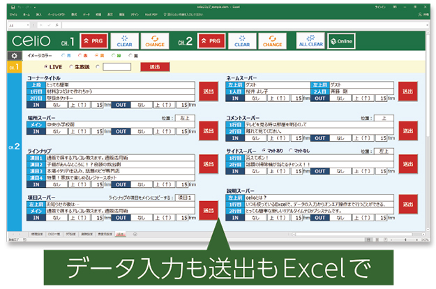 celioは、専用の送出ソフトが必要だった今までのテロップシステムとは異なり、マイクロソフトの表計算ソフと「Microsoft Excel」のシートがそのまま使用可能で、Excelでデータの入力からオンエア操作まで行うことができるようになる。celioの特長は以下の通り。