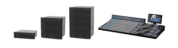 左からビデオペリフェラルAV-PF8000シリーズ、ルーティングスイッチャーAV-WM8000 シリーズ、ライブスイッチャーAV-HS8300シリーズメインフレーム、ライブスイッチャーAV-HS8300シリーズコントロールパネル/メニューパネル