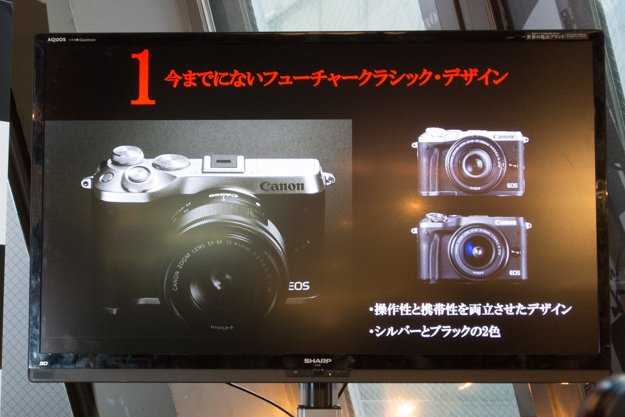 また、EOS M6のもっとも大きな特徴といえば、デジカメらくしないクラシックなデザインの採用だ。その特徴的なデザインは、30代から40代の男性をターゲットとして昔のフィルムカメラのようなクラシカルなデザインを狙って実現をしたとキヤノンの国井智和氏が語った。EOS M6のボディカラーはシルバーとブラックの2種類でシルバーがメインカラーとなっている。