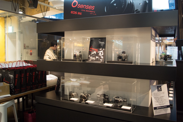 カフェの中央にはタッチ&トライスペースのコーナーが設けられており、4月7日に発売をした電子ビューファインダー「EVF-DC2」をつけた状態でEOS M6を試すことができるようになっている