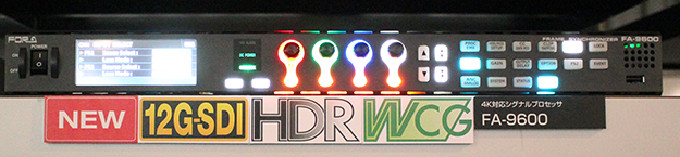 4K、12G-SDI、HDR、広色域のすべてに対応したマルチパーパスシグナルプロセッサ「FA-9600」。2系統のHD/SD入力それぞれにフレームシンクロナイザを内蔵し、ITU-R BT.2100規格にも対応