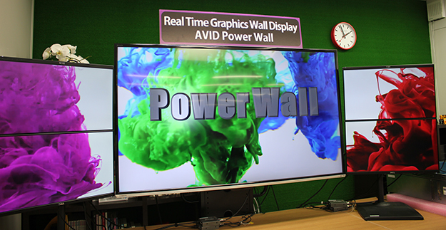ビジュアル・グラフィックス株式会社が取り扱うビデオウォールシステム「AVID PowerWall」。最大7680×4320の8K解像度描画に対応。スタジアムクラスの大型ビジョンにも対応しており、様々な映像演出を実現するレンダリングシステム。8面のHDモニターを組み合わせており、パネルの組み合わせに合わせた映像制作が可能