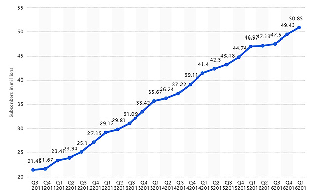 Netflixは過去5年間で米国の加入者数を2倍に増やした。2017年には、昨年比6.6%アップの1億2,800万人のユーザーがNetflixのコンテンツを視聴すると算出されている(米eMaketer調べ)。大人が1日でオンラインビデオを見る時間は、平均75分だという。Netflixの記録は「コードカット」によるケーブルテレビ離れによるものではなく、自身の加入者ベースの拡大によるものとStatistaでは見解している。現に主要ケーブルテレビ加入者数は、過去5年間で400万人しか減っていない。その間に増加したNetflixの加入者数は2,700万人である。