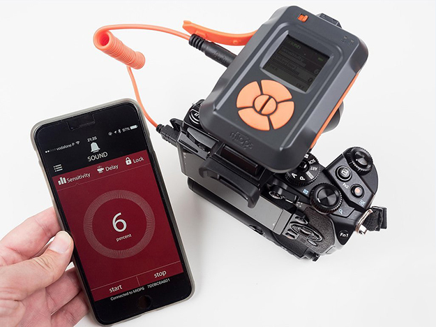 Miopsは光や音の検知、レーザー遮断など、様々なモードでレリーズをきることができる装置。HDR撮影やタイムラプス撮影機能も搭載している。Miops本体よりモード操作を行い機能をONにするだけで、しきい値、感度なども設定可能。本体サイズは約62mm×100mmx20mm、重量約80g。底面にコールドシューがあるため、カメラに直接装着可能。
