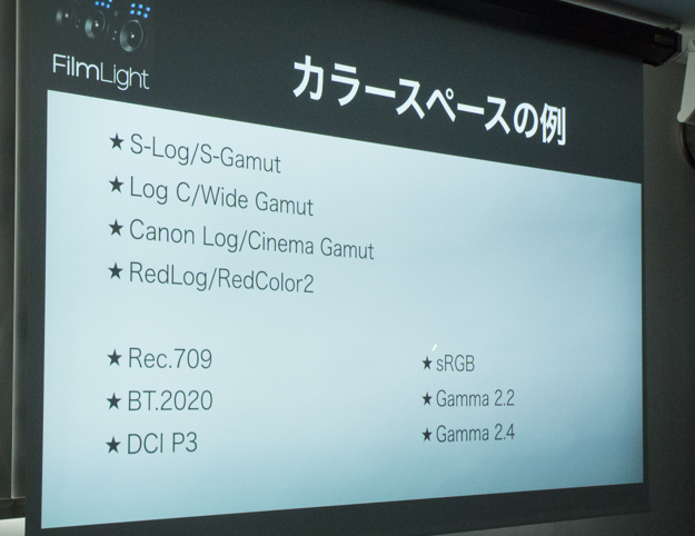 上の「S-Log/S-Gamut」「Log C/Wide Gamut」「Canon Log/Cinema Gamut」「RedLog/RedColor2」はカメラごとのカラースペース。下の「Rec.709」「sRGB」「DCI P3」は表示側のカラースペース