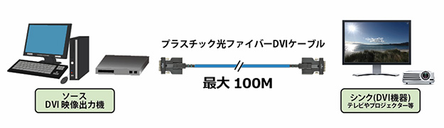 プラスチック光ファイバーDVI-Dケーブルシリーズは、国産GI-POF(Plastic Optical Fiber)を採用し、長距離でも大容量高速伝送が可能。通常のガラス光ファイバーケーブルの許容曲げ半径(約15mm~20mm)に比べ、許容曲げ半径は5mm以下。ケーブル外皮には難燃性プラスチック素材(プレナムケーブル・UL444 CMP)を採用し、燃えにくい設計となっている。ガラス光ファイバーケーブルに比べて折れの可能性が低く、ガラス光ファイバーケーブルで発生しうる破損時のガラス飛散が発生しないという。