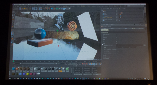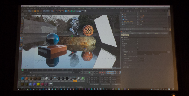 「拡張OpelGL」の「反射」の項目の中の「スクリーン空間ローカル反射」という項目にチェックを入れるとオブジェクト相互の反射がビューポートで確認できるようになる。画面は「スクリーン空間ローカル反射」がオフの状態