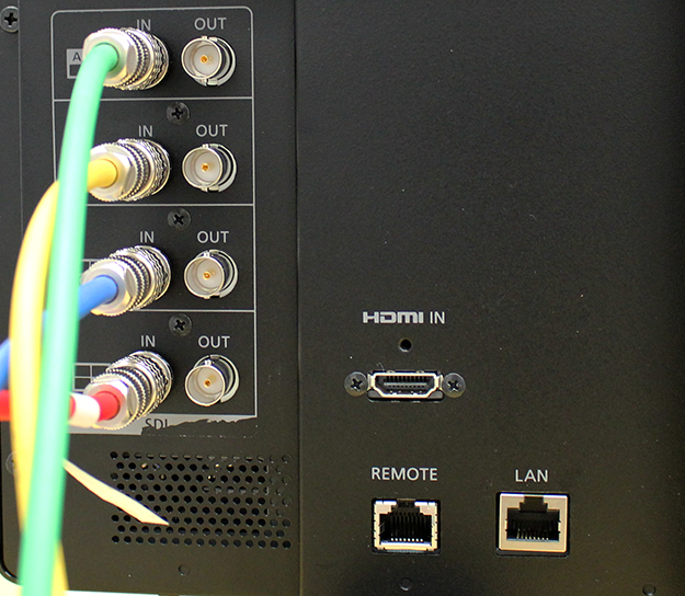 12G-SDI端子(IN/OUT各4系統)の搭載により、3G-SDI端子搭載の4KディスプレイではSDIケーブルを4本必要としていた4K60P映像の送受信が、12G-SDI対応ケーブル1本で可能となった。12G-SDI対応ケーブルの接続により、4K60Pの映像信号を4系統入力でき、1つのディスプレイで信号を切り替えながら複数の4K映像を確認することが可能。また、HDMI端子も搭載しており、4K60P映像をケーブル1本で受信し再生することが可能。「SMPTE ST 2086」のHDRメタデータの表示にも対応しており、コンテンツ内の最大輝度や平均輝度などの情報を確認可能。その他にも、スイッチャーからのコントロール制御が可能なREMOTE端子や、外部機器からのコントロール制御が可能なLAN端子を搭載。電源部には、AC100~240Vに加え、DC24Vを採用。