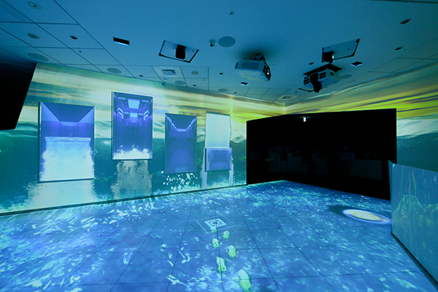 同エントランスエリアの映像投写には、常設モデル「EB-L1300U」をはじめ、プロジェクターを合計29台使用。至近距離からは超短焦点ゼロオフセットレンズ「ELPLX01」を使用し映像を投写している。映像コンテンツの第一弾は、水・樹・土・風など地球を構が施されている。また、フロアに流れる川面には、脈々と受け継がれるエプソンのコア技術が、さまざまな商品に昇華していく様子を表現しているという。