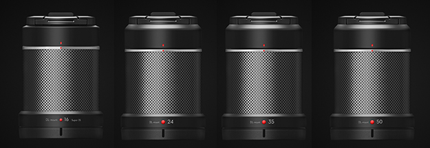 空撮専用マウントシステムDJI DLマウントを採用し、単焦点レンズに最適化された超短のフランジバックを実現。焦点距離16mm、24mm、35mm、50mmの各レンズが使用でき、それぞれ開放F値はF/2.8。カーボンファイバー製のため、軽量で耐久性に優れている。
