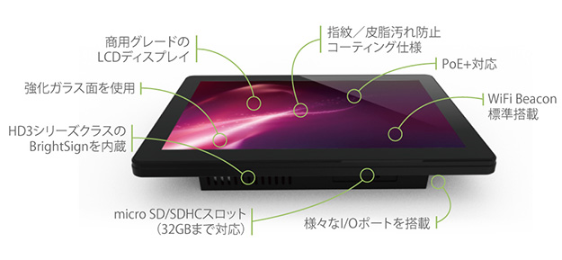 同シリーズは、10.1インチおよび15.6インチのタッチディスプレイにBrightSign社のサイネージプレーヤーを内蔵。Wi-Fi Beaconを標準搭載し、PoE+にも対応しているため、場所を選ばずに手軽にサイネージディスプレイを設置可能だとしている。Beacon機能を利用してスマートフォンとの連動も可能。