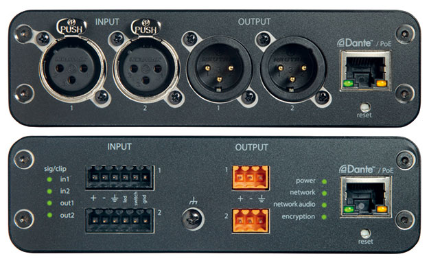 ANI22は、2入力2出力のDanteオーディオインターフェース。最大2系統のアナログ入力(マイク/ライン)をデジタル信号としてDanteネットワークに入力し、ネットワーク上の任意の2チャンネルをアナログ信号として出力可能。入出力端子はXLR端子とユーロブロック端子の2モデル。標準的なイーサネットケーブル1本でPoEによる電源供給、音声送出、制御を行う。ブラウザベースのソフトウェアにより、PC上からモニタリング、制御が可能。付属のマウント金具を使用することでテーブルの下などに固定可能。