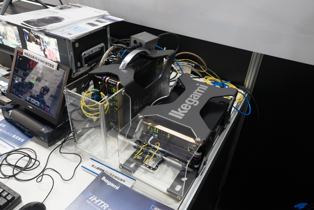 池上通信機ブースと光ケーブルを接続したリモートプロダクションシステムも目を引く展示となっていた。リモートプロダクションとは、スポーツイベントの際に中継車の台数が限られていて中継車が出せない場合や、機材やスタッフの数が限られているような状況のときに、スタジアム側には最低限の機材とスタッフだけを置いて、放送局と光ファイバーでつないで局側のほうの機材やスタッフを使って制作を行っていく方法のことだ。