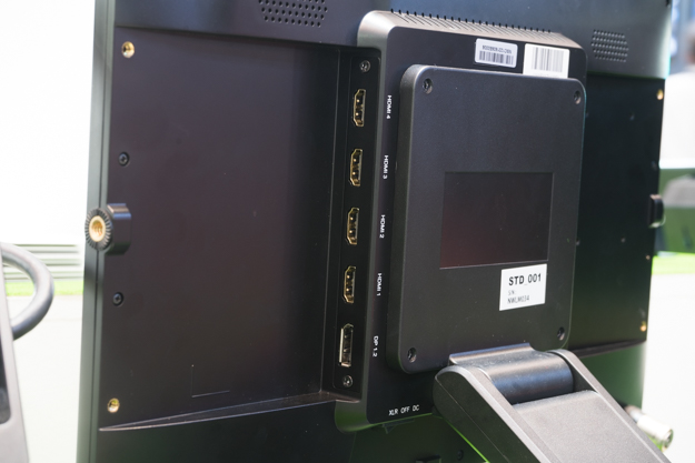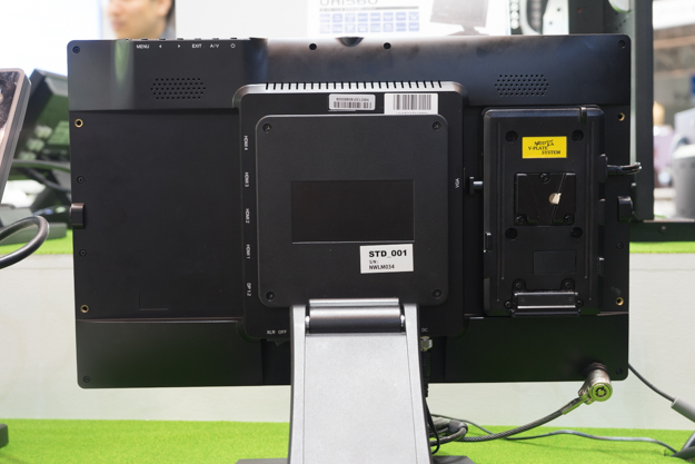 新製品の中でも注目したいのが4K UHD 15.6インチの業務用液晶ディスプレイ「UH1560」。Vマウントのバッテリーの搭載が可能で、アイ・ディー・エクスなどから発売されているVマウントのバッテリーを使って屋外での使用が可能。もちろん通常のACアダプタでも動作し、ACアダプタのDC入力とバッテリーの駆動をどちらのソースを選択するかを背面のスイッチで切り替えることができる。