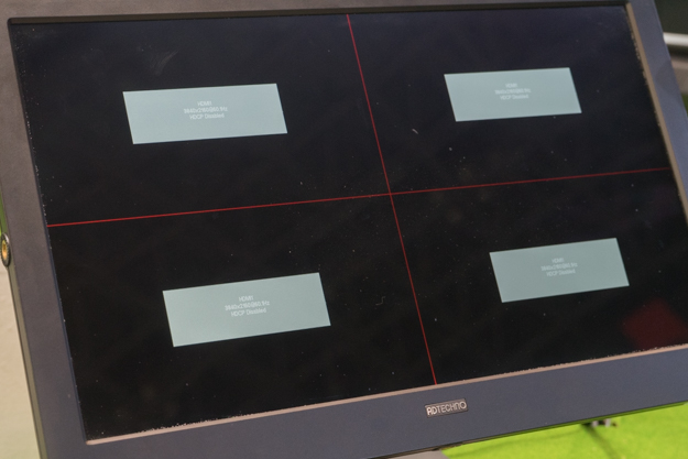フルHD映像を同時表示させる「4分割画面表示」機能や、2つの映像を上下または、左右に表示させる「2分割画面表示」機能、画面の中に小窓表示する「PinP画面表示」機能を搭載。4分割の機能であれば、「左上はHDMIの1」などの設定や、枠線の太さや色を変えたりもできる。今までのモニタと同じように上下左右の反転も可能。上下左右側面の4カ所に1/4インチネジ穴を搭載し、三脚やアームなどでの設置、壁掛けで使うことができる。