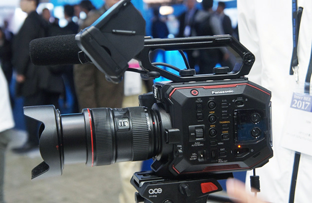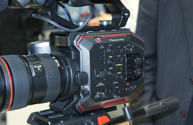 コンパクトシネマカメラAU-EVA1。新開発の5.7Kスーパー35mm MOSセンサーを搭載しており、V-Logガンマおよび広色域V-GamutのほかデュアルネイティブISOに対応。4K60Pの高画質ハイフレームレートなどVARICAMを継承する機能を搭載している。SDXCメモリースロットを2基備えており、4K/2K 10ビット4:2:2で収録可能