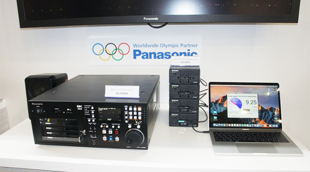 8KスーパーハイビジョンレコーダーAJ-ZS0580。これまでも8K-DualGreen方式の8Kメモリーカードレコーダーを開発してきたが、今回AVC Intraコーデックに対応したモデルを出展した。8K-YPbPr方式59.94pに対応しており入力端子は12G-SDI×4となっている。コーデックはAVC-ULTRA(AVC-Intra 4:2:2)で、expressP2カードおよびmicroP2カードに記録。また、HD同時記録や4KおよびHDの同時出力にも対応している。中央にあるのはThunderbolt 3接続で高速転送が可能なメモリーカードexpressP2ドライブAU-XPD3でexpressP2カード、P2カード、microP2カードの3種類のP2カードに対応