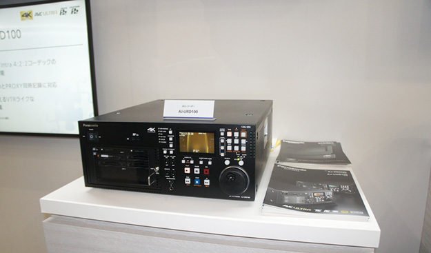 4KレコーダーAJ-URD100。AVC-ULTRA(AVC-Intra 4:2:2)コーデックで4K 59.94p収録が可能なほか、12G-SDI×1/3G-SDI×4の入力端子を備えているほか、expressP2カードに記録する
