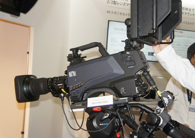 4KスタジオカメラAK-UC3000。特殊変換レンズ内蔵、既存の2/3型レンズをアダプターなしで使用可能。単板の新開発4K大判センサー搭載しており、豊かな諧調を表現できる。UHD出力とHD/SD同時出力に対応
