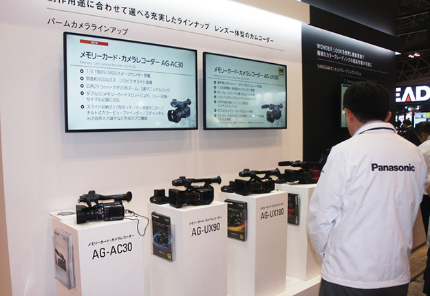 パームカメララインアップとして新発売のAG-AC30のほか、AG-DVX200やAG-UX180、AG-UX90を出展。AG-AC30はこのラインナップで最も小型軽量のモデル。光学20倍ズームを搭載しているほか、レンズ操作は3連マニュアルリングを装備。照射距離1mで300lxの照度をもつLEDビデオライトが標準搭載されており、拡散フィルターや色温度変換のフィルターも装着可能