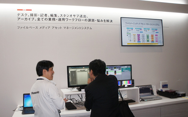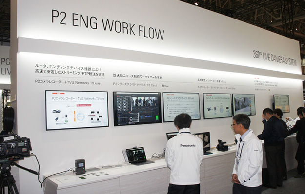 P2 ENGワークフローシステム。ネットワークを介してクラウドに常時接続されることにより、取材映像クリップの自動転送を実現。複数クルーからの全てのカメラステータス、全映像ソースのプレビューとカット編集がデスクトップ上で可能となるP2 CastやTVUの無線伝送システムと連携することで、より高速かつ安定した伝送を実現したシステムなどを紹介