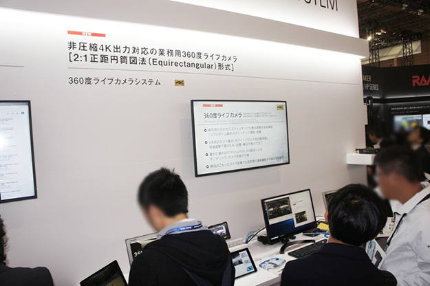 非圧縮4K出力対応の業務用360°ライブカメラシステム。4つのHDカメラを搭載したカメラ部分と合成画像を生成するベースユニットの2ピース構成で2:1正距円筒図法(Equirectangular)形式で360°画像を構成する方式。被写体に合わせてステッチング位置を調整する高精度リアルタイムステッチング機能を搭載