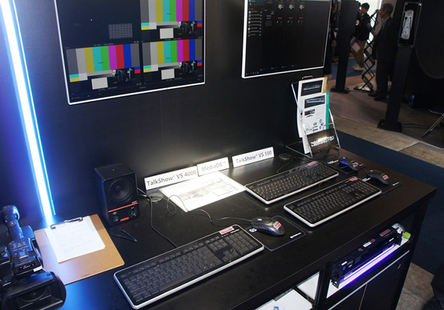マイクロソフト社「Skype TX」テクノロジーを搭載したビデオ中継システムTalkShow VS 4000/TalkShow VS 100。Skype経由でのビデオ電話に対応し、ライブでオンライン対話が可能。Skype経由で各国にいる番組ゲストに繋ぐことで、場所に関係なくリアルタイムで、複数のゲスト間で繰り広げられる討論会やインタビュー番組を実現できる。リアルタイムメディアエンコーディング+ライブストリームビデオ配信システムMediaDSとシステムでデモが行われていた