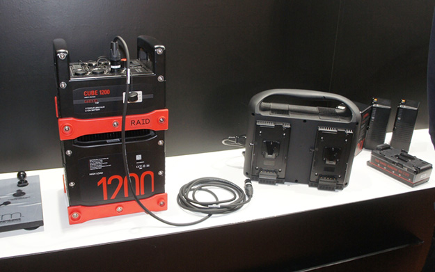 bebob社CUBE1200バッテリー。フォーカス、ズームリモコンなどを扱っていたbebobだが、最近はバッテリーにも進出。写真のCUBE1200バッテリーは1176Whの大容量で5V/12V/24V/48Vの出力に対応。LED照明で48Vタイプの製品があるが、対応するバッテリーは少なく貴重な存在。ほかにもVマウントタイプのバッテリーも出展していた