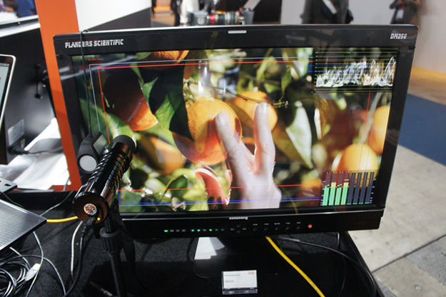 FlandersScientific社の24.5型DM250OLEDモニター。波形モニターやベクトルスコープ、CIE色度表示、16chオーディオレベル表示のほか、クロスコンバートやHDRプレビューモードを装備。1920×1080解像度10bit、コントラスト比5000:1のパネルを搭載している