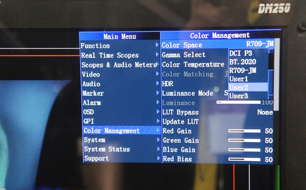 DM250OLEDモニターは、Rec.709やBT.2020やDCI-P3などに対応しているほか、ユーザープリセットも可能。インターフェースは3Gbps/HD/SD-SDIのほかDisplayPortを備えており、画面ズームやセーフエリア表示なども行える