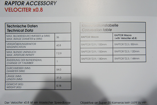 RAPTORレンズにVELOCITER×0.8を装着した時の焦点距離や性能などのデータ。なお、これとは別にT2.0、35mmフルサイズに対応したPLマウントに装着する1.6倍のエクステンダーS35×8K Expanderも出展されていた