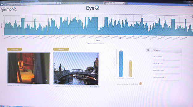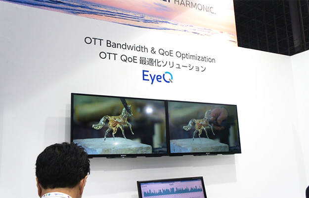 OTT QoE最適化ソリューションのコーナーでは、EyeQ ビデオ圧縮最適化ソリューションにより、配信帯域を最高50%削減することで、CDNの配信コスト削減を可能にし、低遅延や少ないバッファリング、より良いQoEによるサービスの差別化を実現可能なワークフローを紹介。Harmonic PURE Compression Engine用のオプション機能であるEyeQにより、人間視覚システム(HAS)の機能を活用し、低ビットレートであらゆるデバイス上での優れた視聴体験ができるビデオ符号化を最適化する革新的なソリューションで、視覚的に何ら遜色なくビットレートの削減が可能