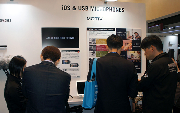 MOTIVデジタルマイク&レコーディングソリューションのコーナー。USBやLightning接続可能なマイクロホンのほか、オーディオインターフェースなどを出展。PCやiPhoneなどに直接接続して使用することができる