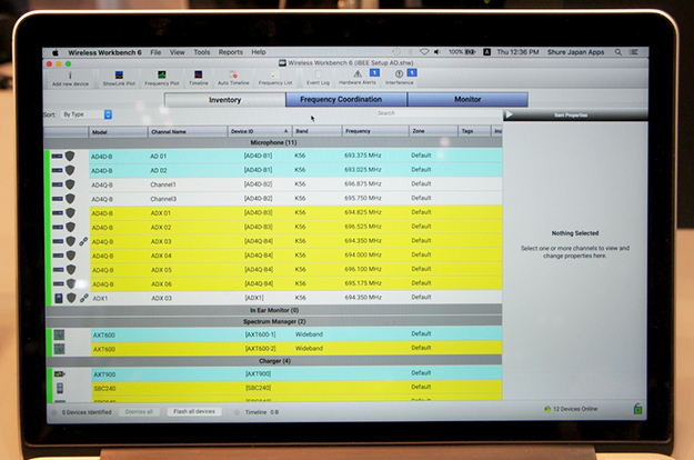 ワイヤレスシステムの周波数選定や各種設定、モニタリングなどが行えるWireless Workbench 6。MacおよびWindowsに対応しており、各送信機からの受信状態や送信機の設定、チャンネル割り当てなどを行うことができる。現場の電波状況をスキャンして最適な周波数を各送信機に設定したり、運用中の受信強度をリアルタイムで波形表示することが可能
