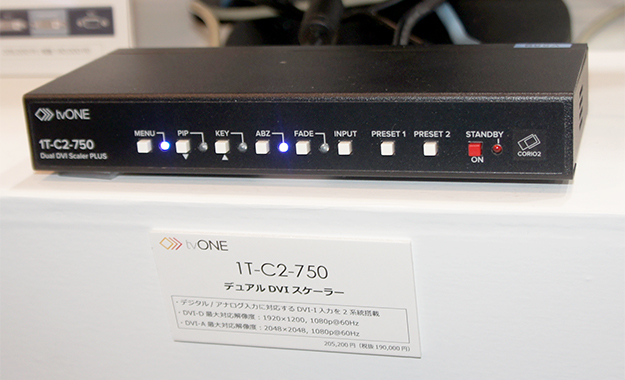 デュアルDVIスケーラーtvONE 1T-C2-750。2基のスケーリングエンジンを搭載しており、2種類の高画質グラフィックを同時にスケーリングすることが可能。拡大縮小は10~1000%まで対応しており、ピクセル単位または%による指定が可能なほか、シングルおよびデュアルピクチャーinピクチャー表示もできる