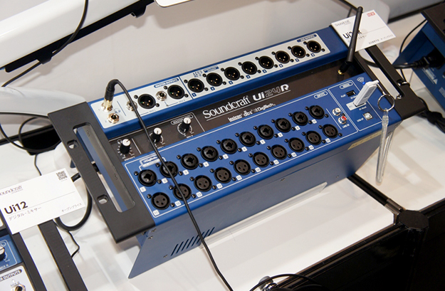 ワイヤレスコントロール対応の24チャンネルデジタルミキサーSoundcraft社Ui24R。Lexicon社のエフェクターやdbx社のハイパスフィルター、4バンドパラメトリックEQ、コンプレッサー、ゲート、ハウリングサプレッサー等を搭載したほか、USB接続のストレージやPCにマルチトラックレコーディングすることが可能