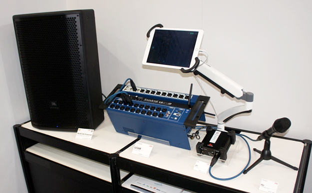 Soundcraft社のUi24Rとdbx社のダイレクトボックスおよびJBL社のパワードスピーカーPRX812Wをセットでデモ。いずれも新製品