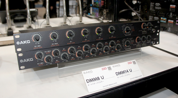 AKG社オートマチックミキサーDMM8 U/DMM14 U。スレッショルドレベルを自動調整して雑音のみを減衰させるNST機能や、ハウリングを防ぐNOMアッテネーション機能のほか、空調などの連続したノイズを判別し、必要のないマイクロホンからの信号を減衰させノイズ検知機能などを搭載しており、精度の高いミキシングを自動で実行することができる。DMM8 Uは6マイク/ライン入力、DMM14 Uは12マイク/ライン入力を搭載