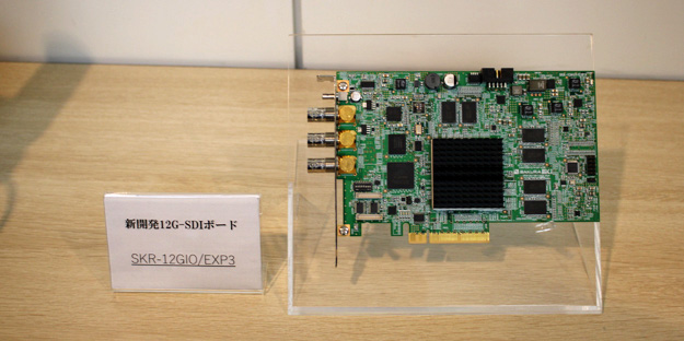 HDR編集のリアルタイム処理を実現するためのキーコンポーネントとして自社開発の「SKR-12GIO/EXP3」を新規開発。12G-SDI入力が1系統、12G-SDI出力を2系統搭載しているのが特長だ。SKR-12GIO/EXP3には、色情報の変換処理やXAVCのハードウェアエンコード機能を搭載。専用ICチップを使わずFPGAをベースに設計しており、将来的に新しい圧縮フォーマットが登場した場合でも、このFPGAを書き換えるだけで変更可能となっている。